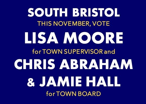 I am happy to endorse Chris Abraham and Jamie Hall for Town Board and Lisa Moore for Town Supervisor. I’ve seen these three listen to what the people of South Bristol have to say and I know that they’ll do everything they can to put the needs of our residents first. It’s what Chris has always done, and I expect nothing different from those who are running along with him.